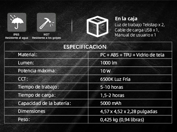 Indicador de batería: la luz de trabajo, de obra con LED recargable tekstap solo se centra en hacer lo que la luz de trabajo de batería necesita hacer Esta luz de trabajo inalámbrica tiene una batería de iones de litio integrada de 5000 mAh